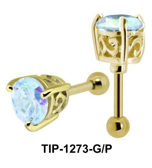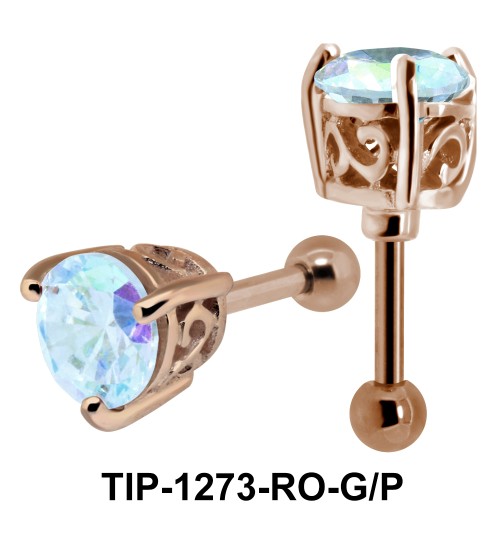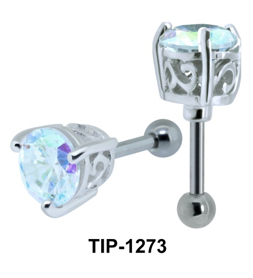 Sophisticated ear piercing with round cut stones in prong setting can also come in gold plating. The helix ear piercing is 1.2 mm. thickness with 6 mm. long bar, 3 mm. balls and an intricately designed prong.