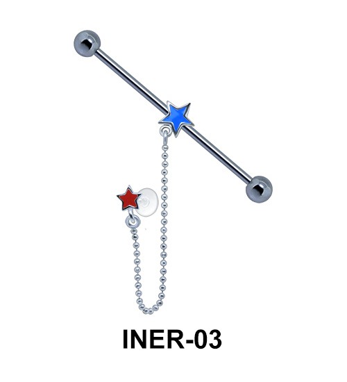 Alluring brass silver plated ear piercing with star design is 1.6 mm. thickness with 36 mm. long bar and 5 mm. balls. The brass silver plated ear piercing can be obtained with industrial chains and different enamels.