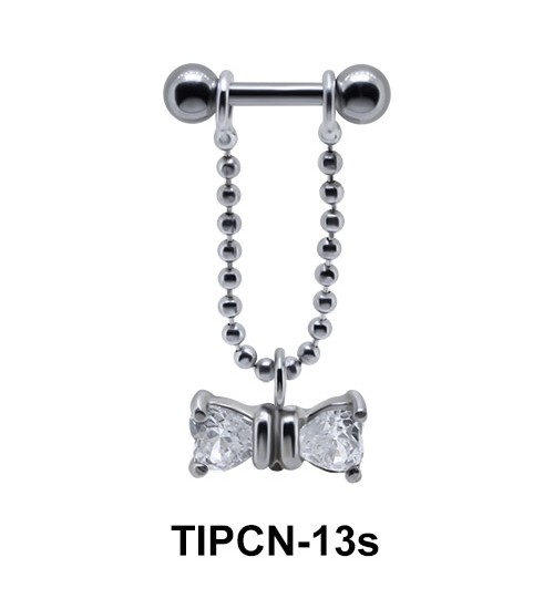 Magnificent 316L surgical steel ear piercing with chain and bow shaped CZ is 1.2 mm. thickness with 3 mm. balls and 8 mm. long bar. The CZ can be yellow, amethyst, black, crystal, olivine, lavender, pink and red in color.