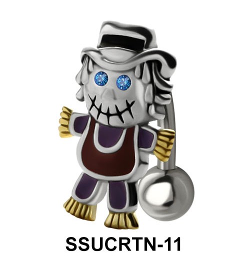 Cute doll shaped surgical steel belly piercing made of 316L surgical steel is 1.6 mm. thickness. The belly piercing has a 10 mm. bar and a 5 mm. ball and rhinestone of various colors.
