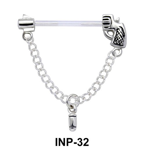 Silver Gun with Dangling Bullet Invisible Nipple Piercing 1.6 mm. (14 GA) with Dangling Chain with PTFE tube
