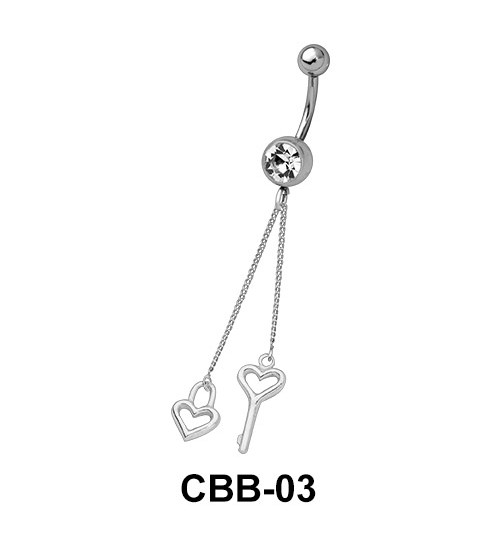 Delightful belly piercing with chain, heart and key is 1.6 mm. thick with 10 mm. long bar and 5 mm. balls. The rhinestone fitted can be rose, crystal, light siam, peridot, sapphire, aquamarine and jet in color.