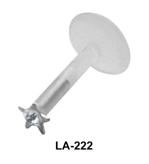 Gorgeous star shaped 316L surgical steel face piercing comes with a 1.2 mm. PTFE push-in for labret piercing. The steel labret piercing is 1.2 mm. thickness with 8 mm. bar. The rhinestone can be of various colors like sapphire, aquamarine, rose, aurore boreale, jet, peridot, light siam and crystal.
